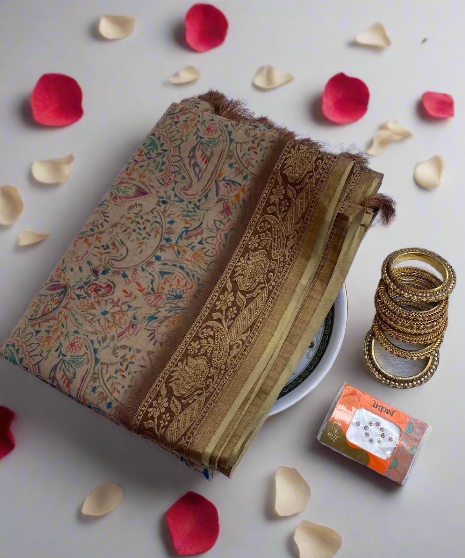 - Description: It's an elegant paisely-print saree that comes with a matching blouse.