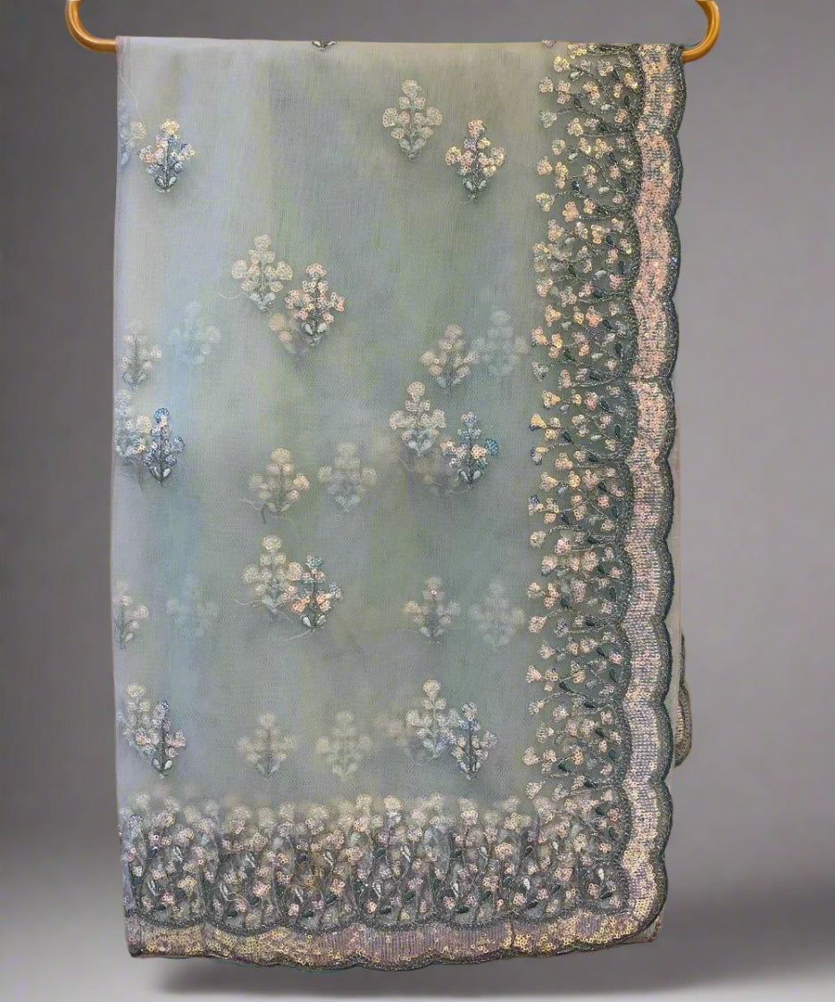- Description: Grace your special occasions with this delicate net saree featuring sequin floral butis and a richly embroidered scalloped border. The warm peach and copper tones add a radiant, festive charm.