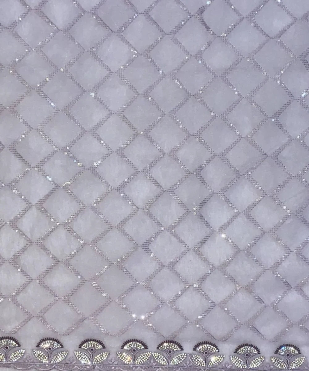 - Description: Elevate your wedding look with this elegant net saree featuring a shimmering sequin checkered pattern. The scalloped border with intricate mirror and thread work adds a touch of regal charm.