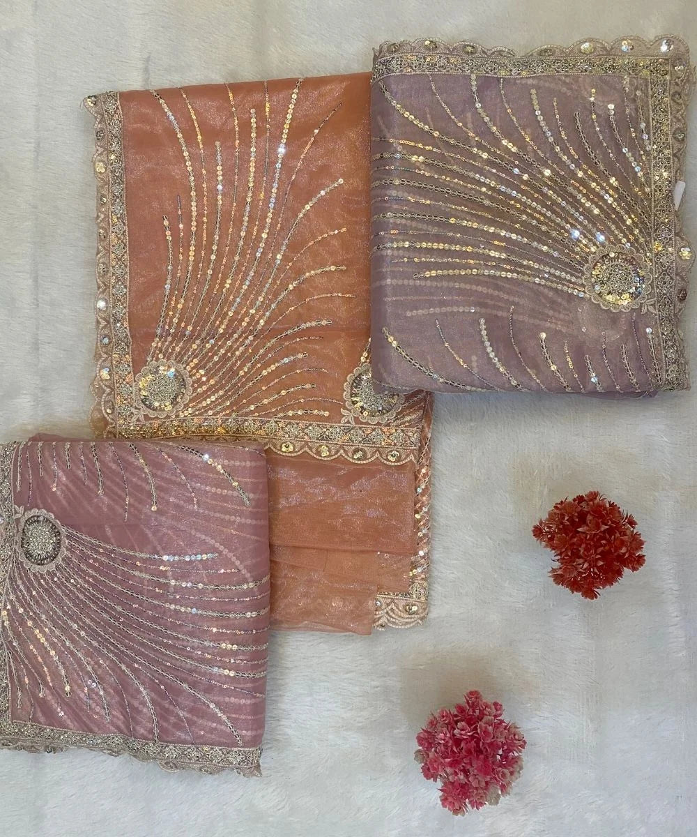 - Description: Elevate your wedding look with this elegant net saree featuring a shimmering sequin floral pattern. The scalloped border with intricate sequin work adds a touch of regal charm.