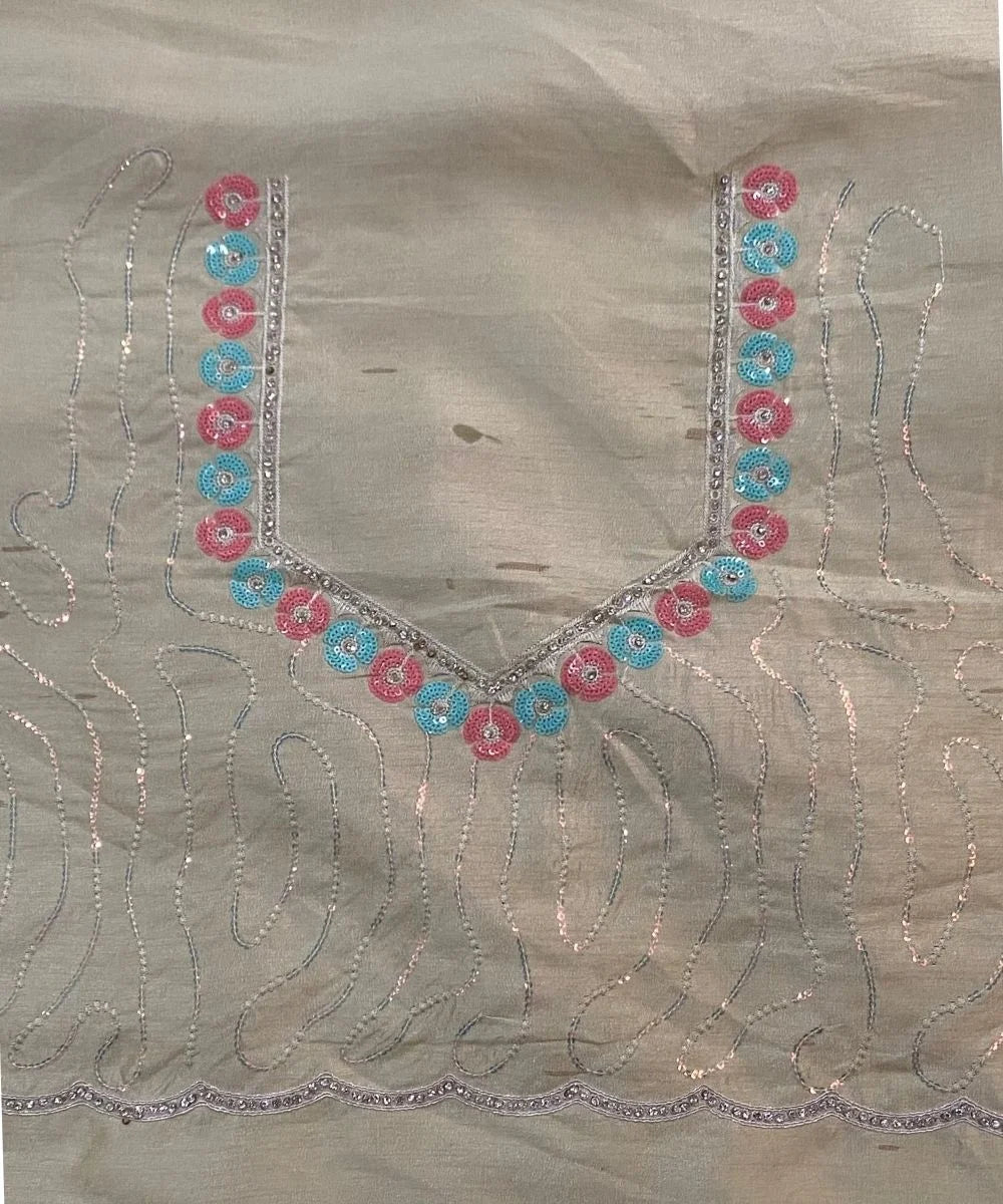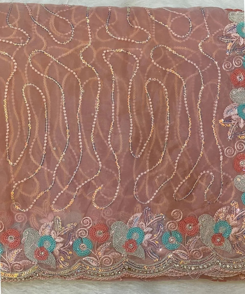 - Description: Grace your special occasions with this lovely glass organza saree featuring sequin floral butis and a richly embroidered scalloped border.
