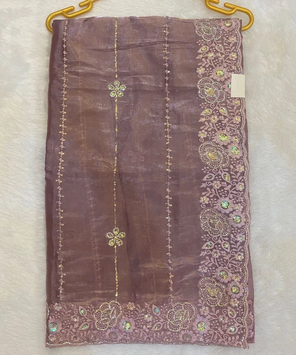 - Description: Sophisticated party wear saree featuring delicate floral embroidery and subtle zircon detailing. Ideal for elegant evening events or graceful festive gatherings.