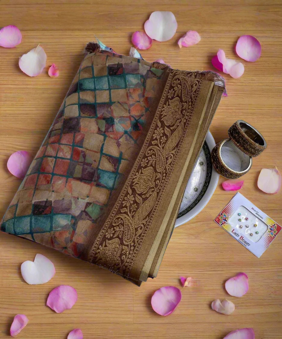- Description: It's a beautiful printed saree that comes with a matching blouse. It drapes beautifully, offering a graceful silhouette.